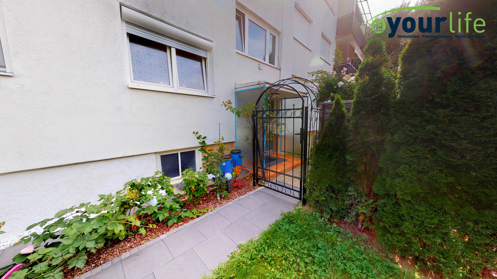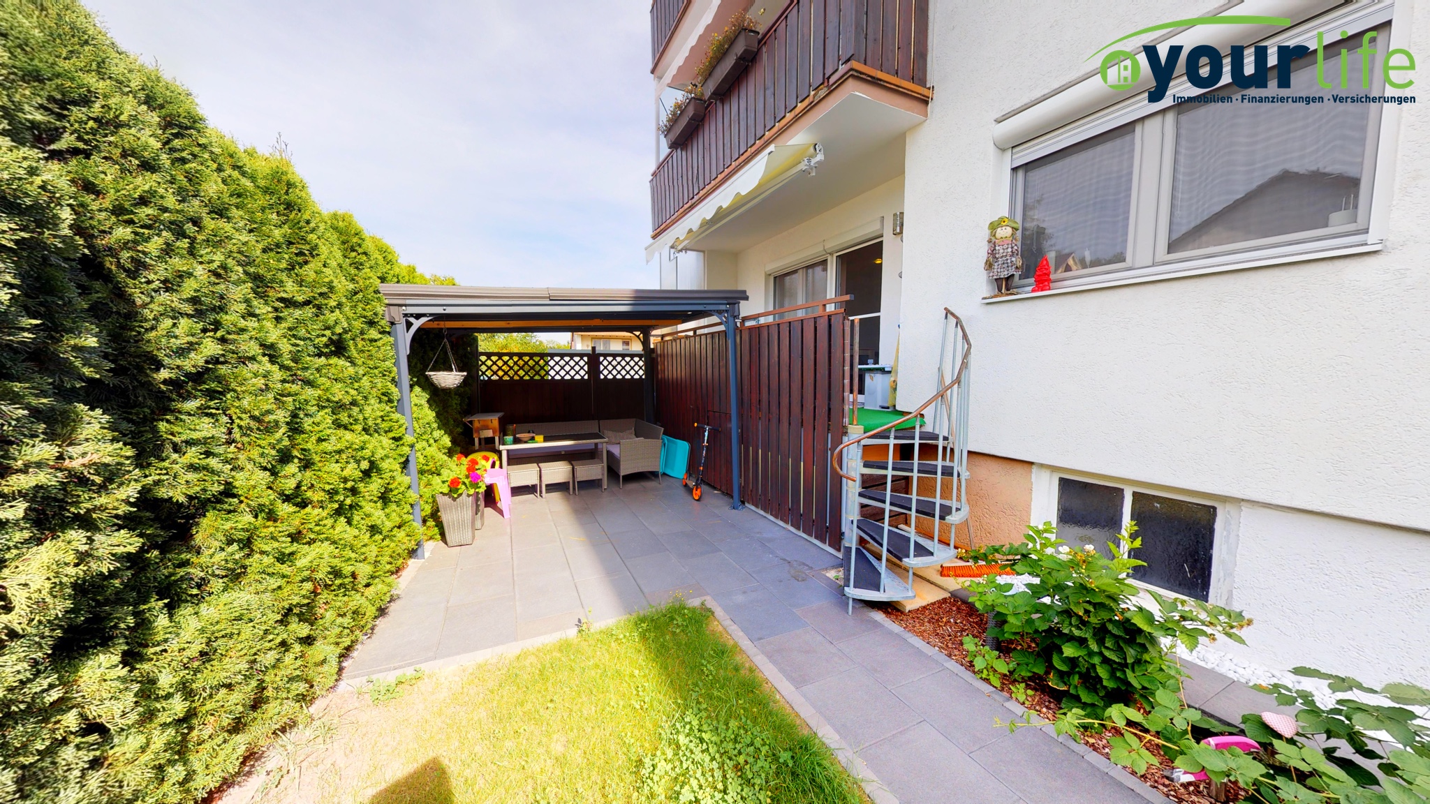 Über das Wohnzimmer ist der Balkon mit Gartenanbindung begehbar, hier befindet sich eine sichtgeschützte Terrasse mit Pavillon. Insgesamt sind der Wohnung zwei Gartenanteile zugeteilt.