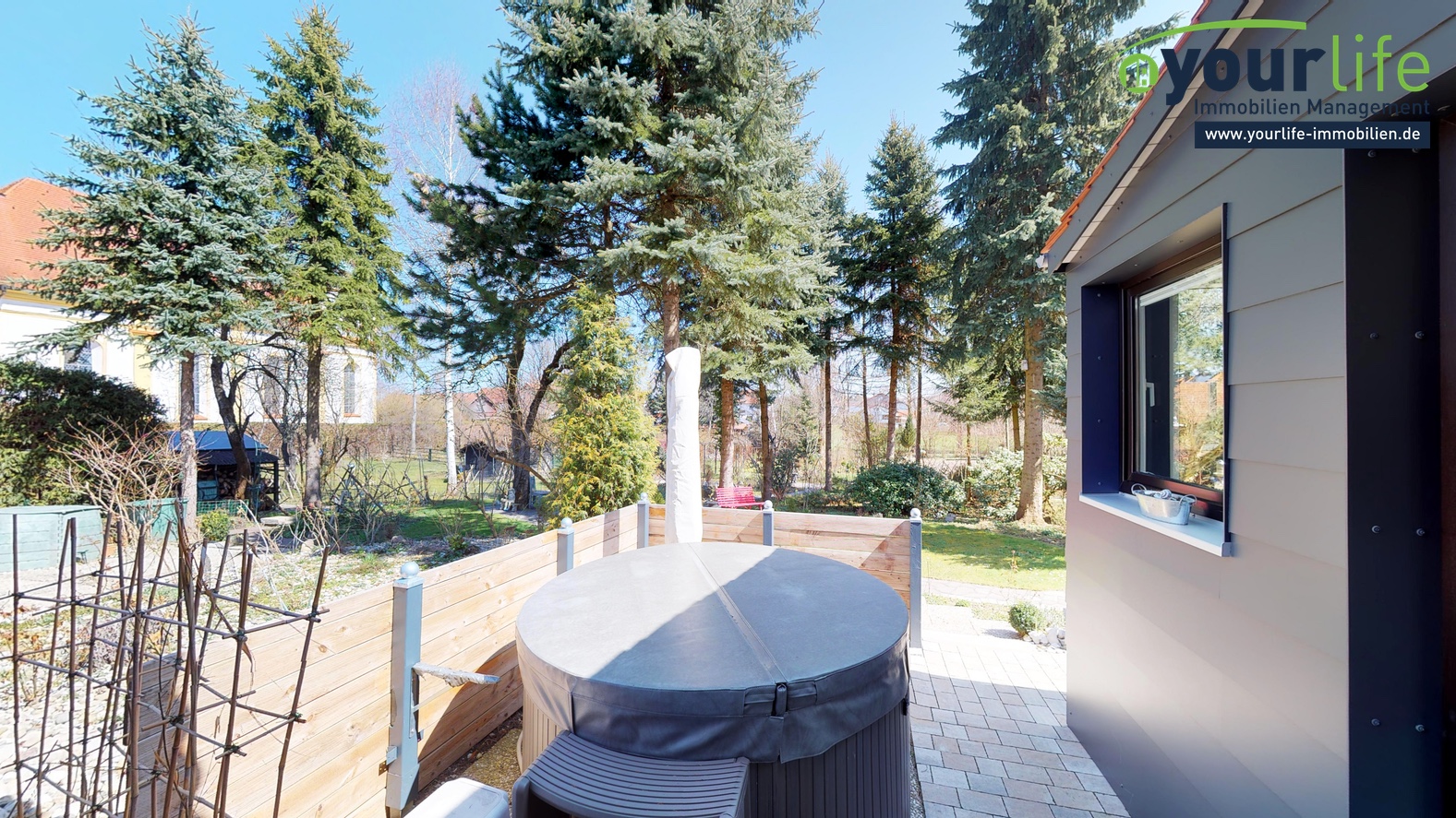 Das über ca. 3200 m² große Grundstück wurde über die Jahre zu einem parkähnlichen Garten angelegt. Hier wachsen viele Rosen, Obstbäume, Sträucher und verschiedene Pflanzen. Es wurden Wege, Beeten und verschiedene Sitzmöglichkeiten um die Natur zu genießen geschaffen. Ein Teil vom Grundstück wurde vor ein paar Jahren noch als Weidefläche für Alpakas genutzt.