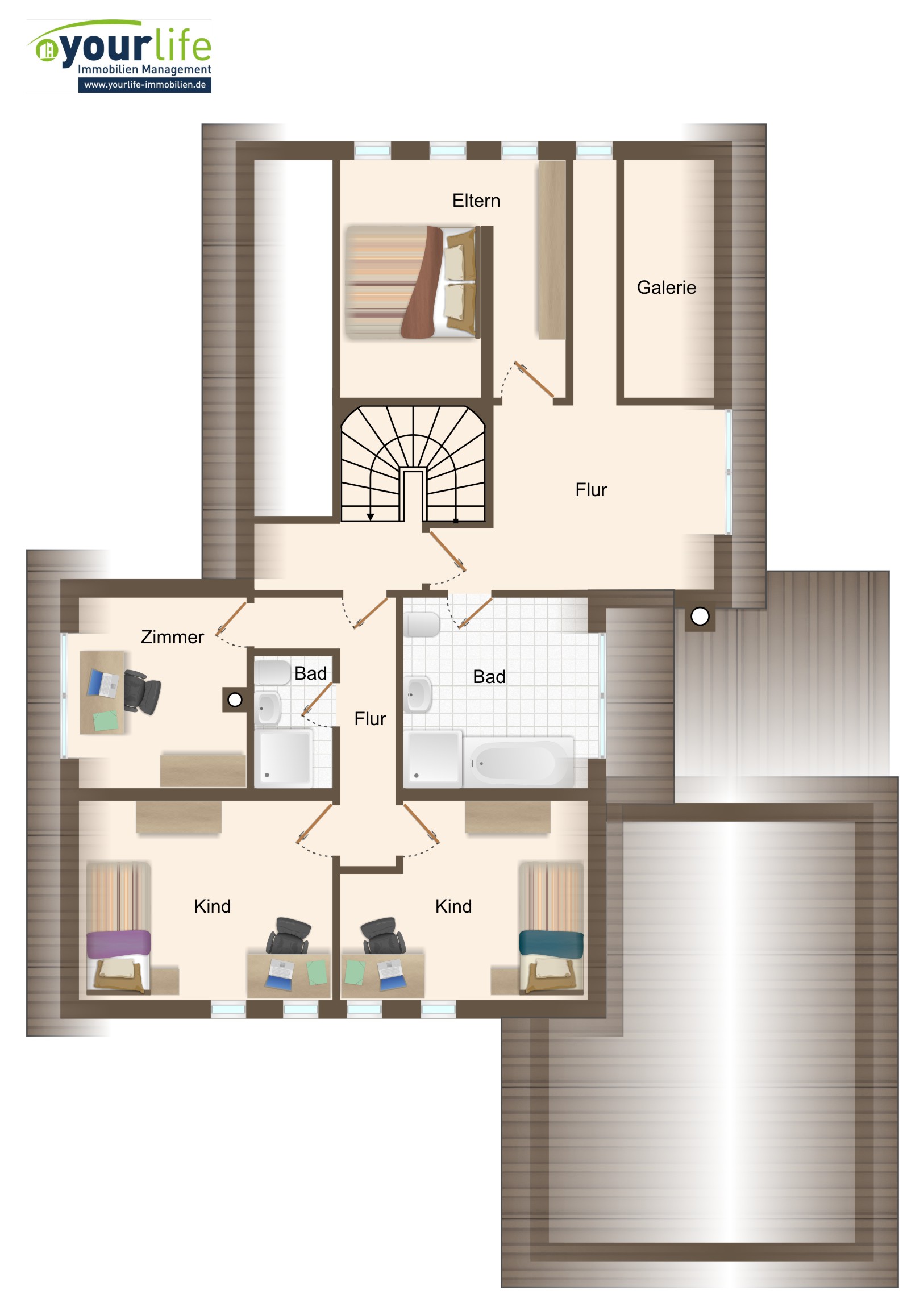 Durch die durchdachte Grundrissplanung hat jedes Familienmitglied seinen Rückzugsort und seine Freiheit. Der Grundriss ist sehr großzügig geplant, von Wohnzimmer bis hin zur Galerie.
