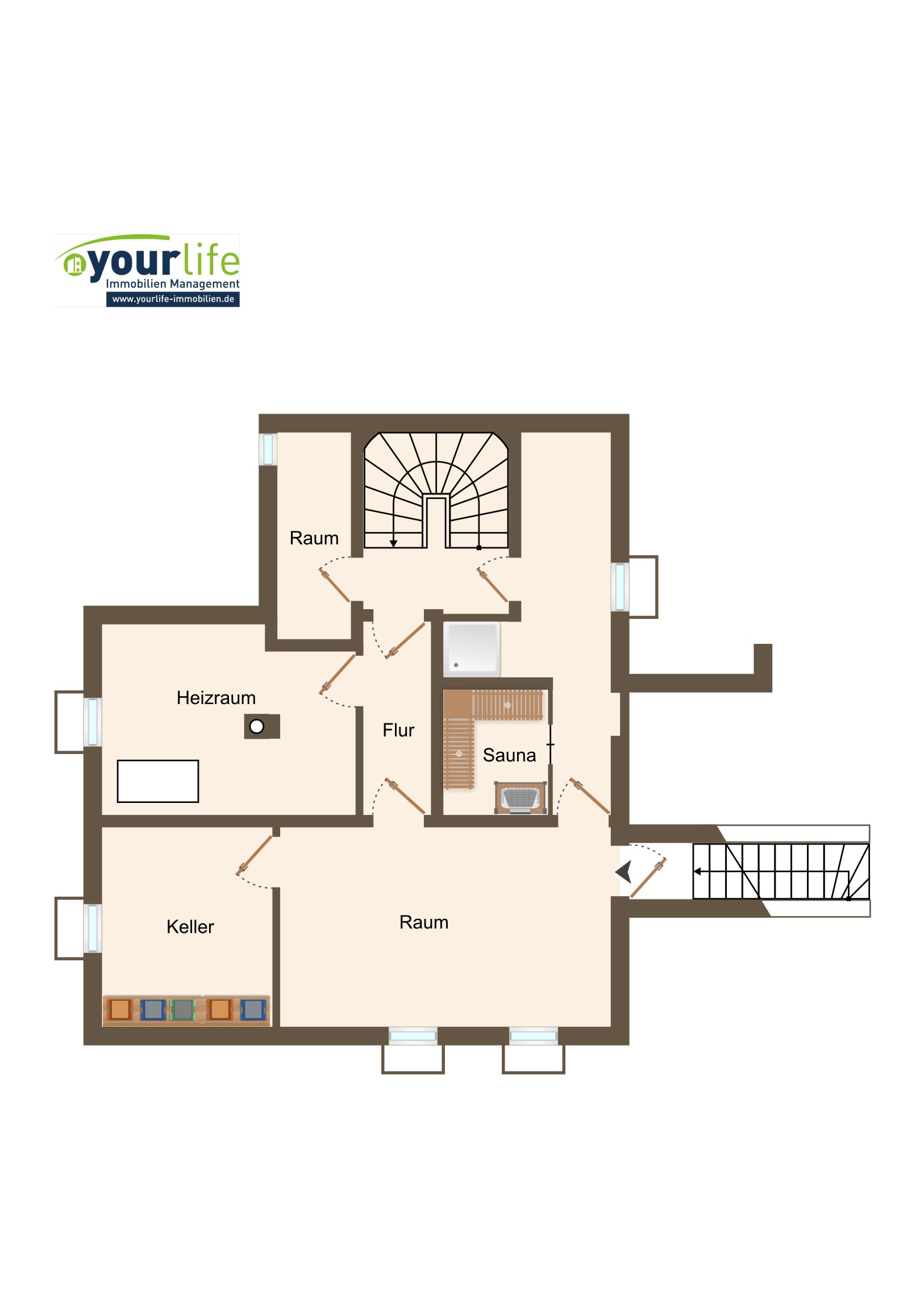 Im Kellergeschoss befindet sich die Heizungsanlage, der Tankraum, ein Saunabereich mit Dusche und ein kleiner Weinkeller.
