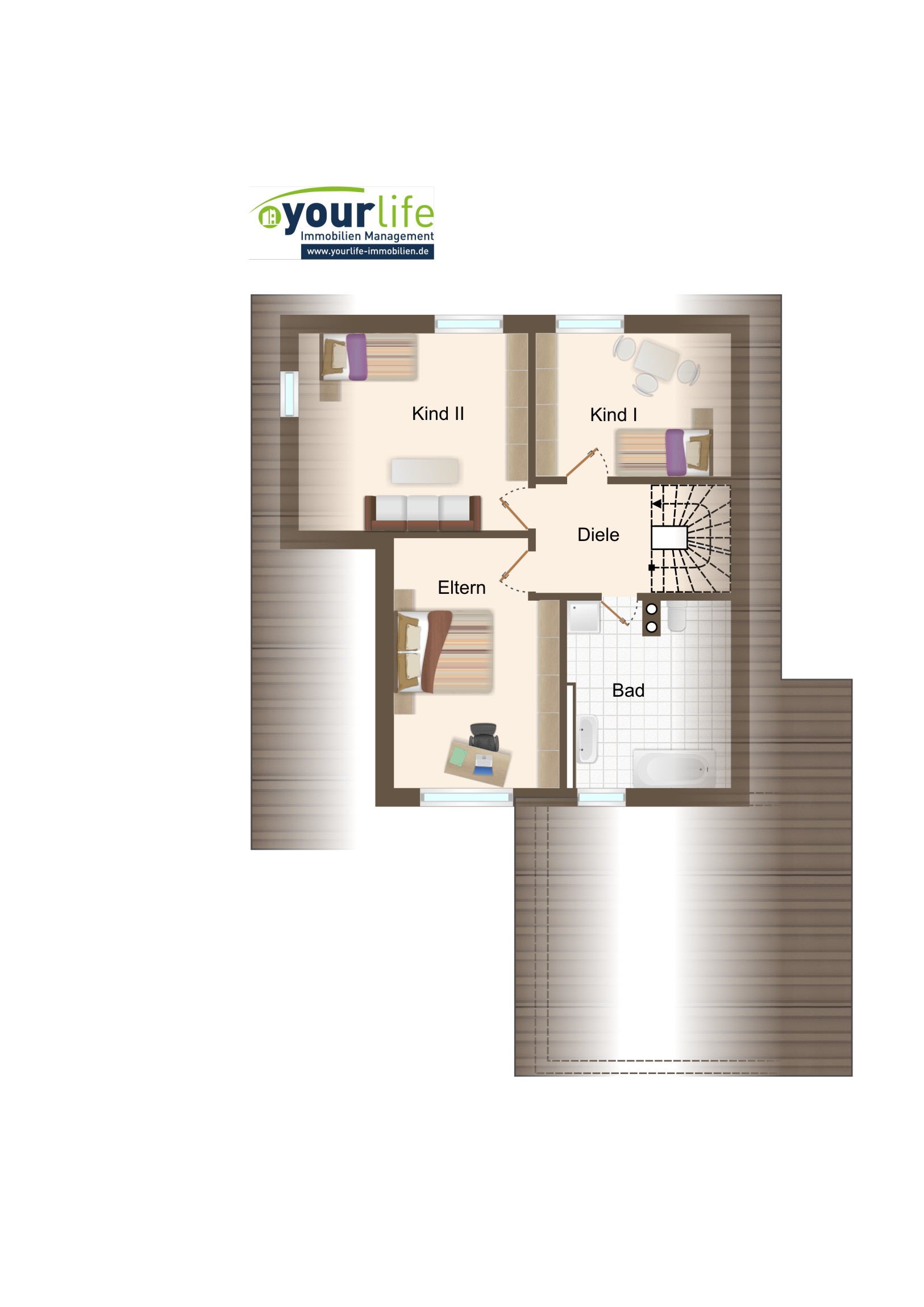 Im Dachgeschoss befinden sich das Elternschlafzimmer, die beiden Kinderzimmer und das große Badezimmer, welches über eine Fußbodenheizung verfügt.