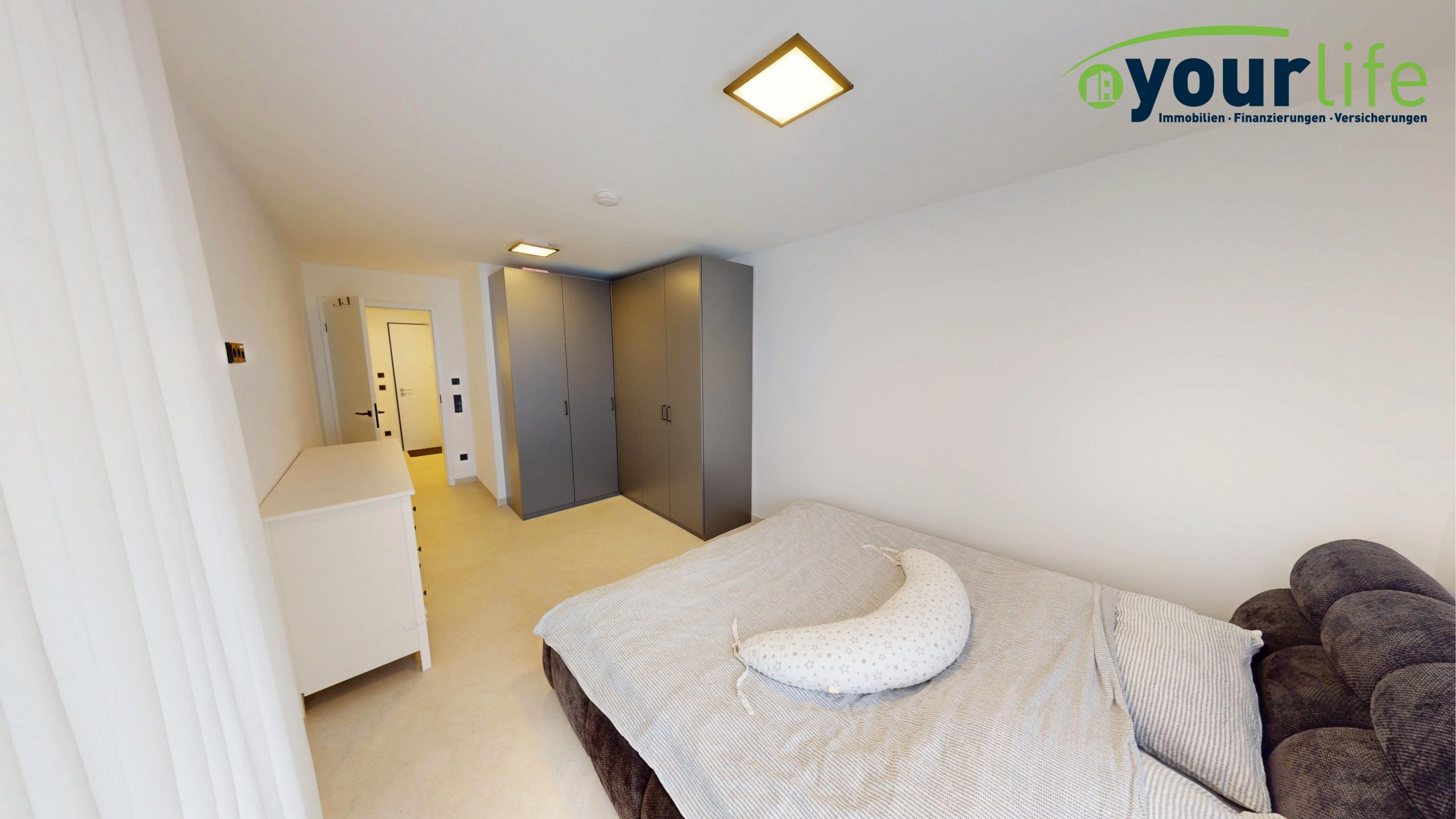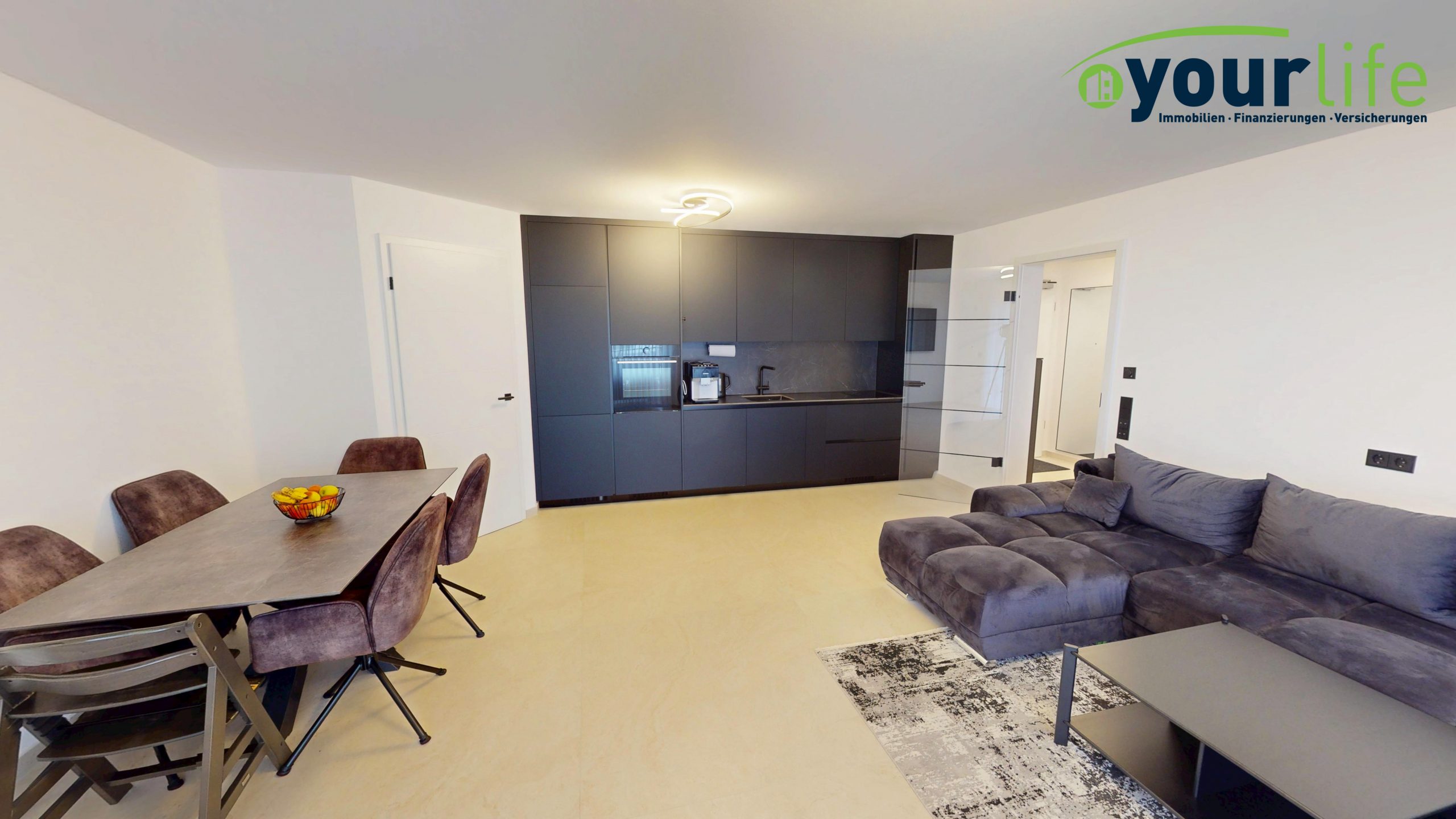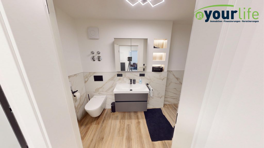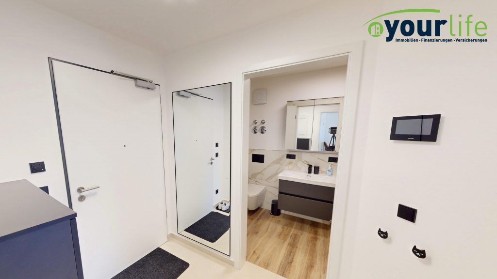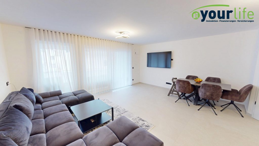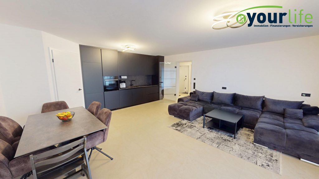 Herzstück ist der helle Wohn- und Essbereich mit Zugang zum großzügigen Balkon, der über eine hochwertige Hebeschiebetür erreichbar ist. Der Wohnbereich ist mit großformatigen Fliesen ausgestattet. Die Wohnung verfügt über eine Fußbodenheizung in allen Räumen, gespeist durch eine effiziente Wärmepumpe.
