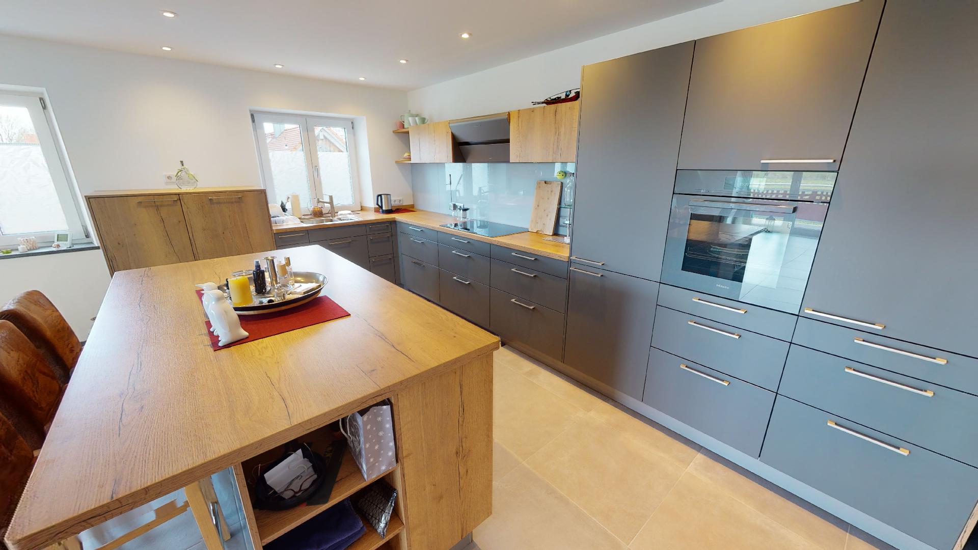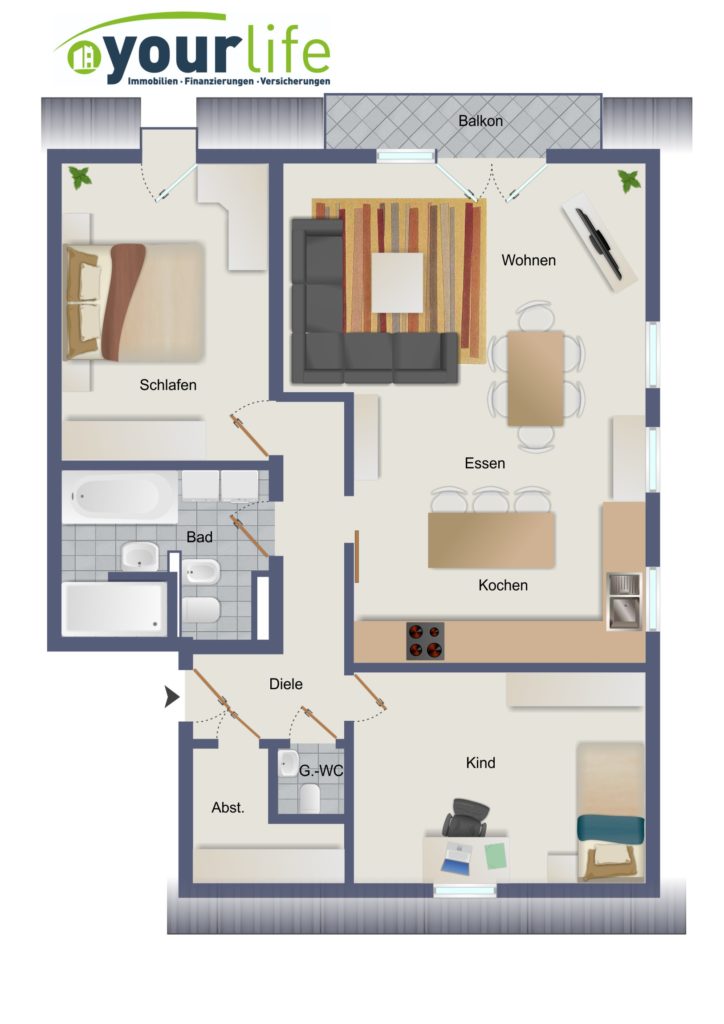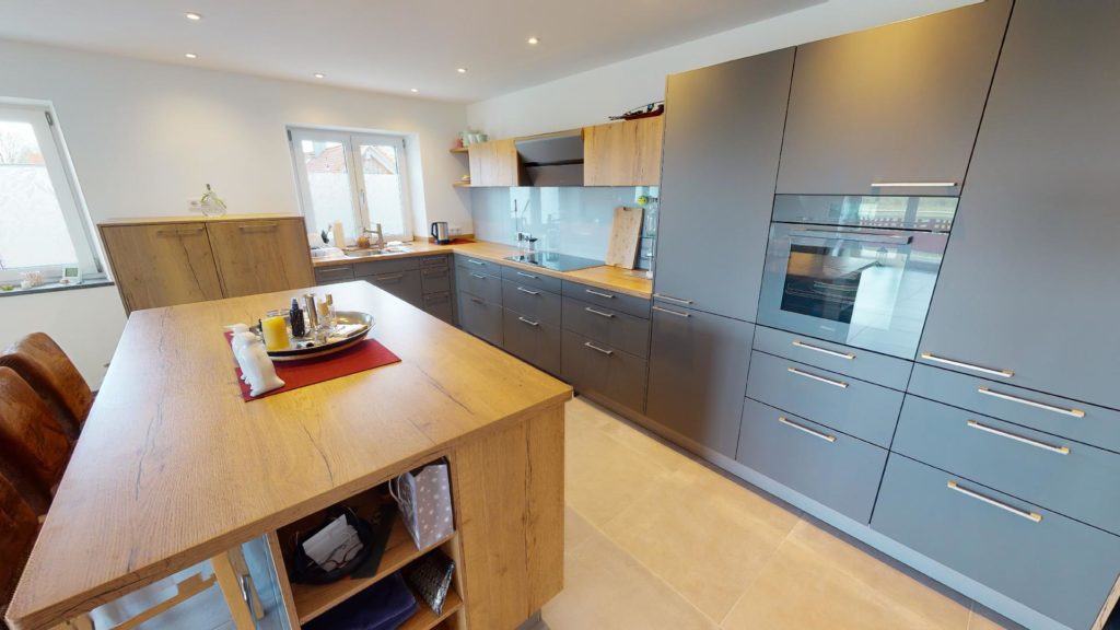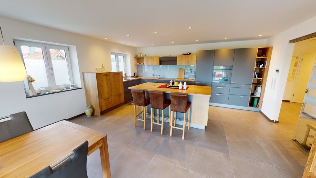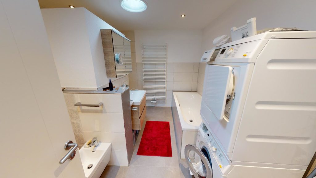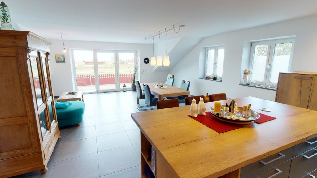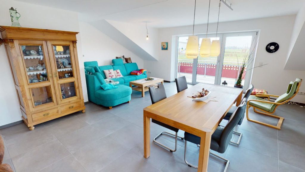 Der Wohnbereich ist in offener Bauweise gestaltet. Der Küchenbereich ist mit einer hochwertigen und modernen Einbauküche ausgestattet. Die gesamte Wohnung ist einheitlich gefliest und verfügt über eine Fußbodenheizung. Ein großer Balkon ist vom Wohnzimmer aus begehbar. Das Badezimmer bietet eine großzügige, begehbare Dusche sowie eine Badewanne. Ein separates Gäste-WC ist ebenfalls vorhanden.