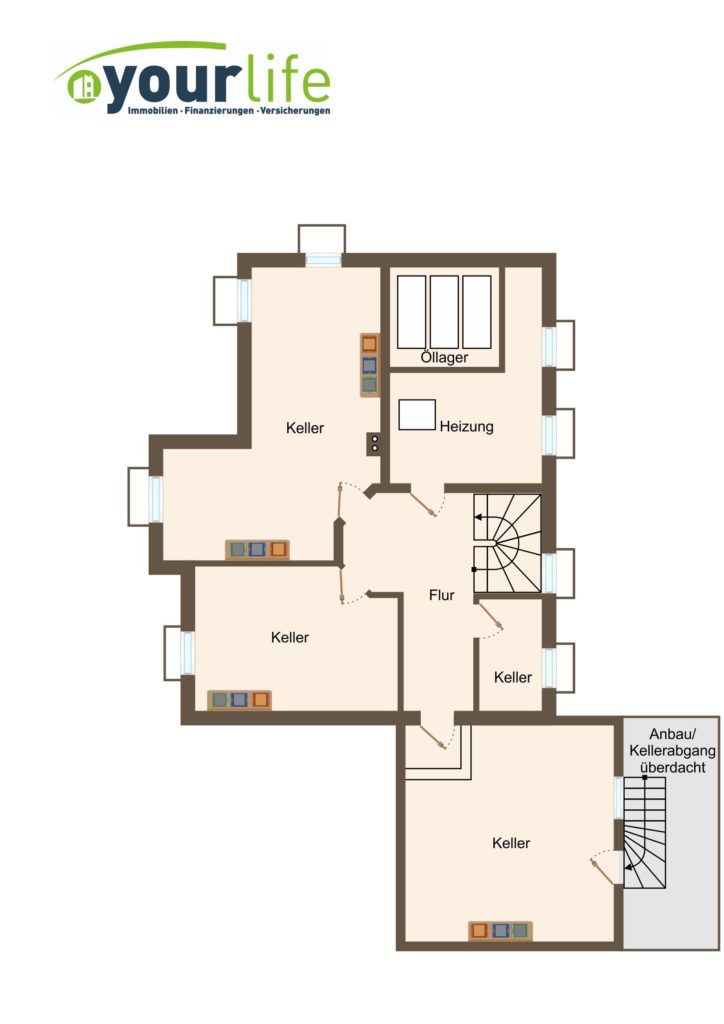 Das Gebäude ist inklusive Garage Vollunterkellert. Im Kellergeschoss befindet sich ein Biokeller, Holzkeller ein Hobbykeller, sowie der Technikraum und eine Werkstatt, die sich unter der Garage befindet.