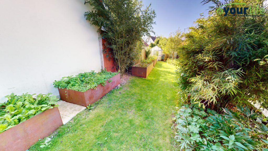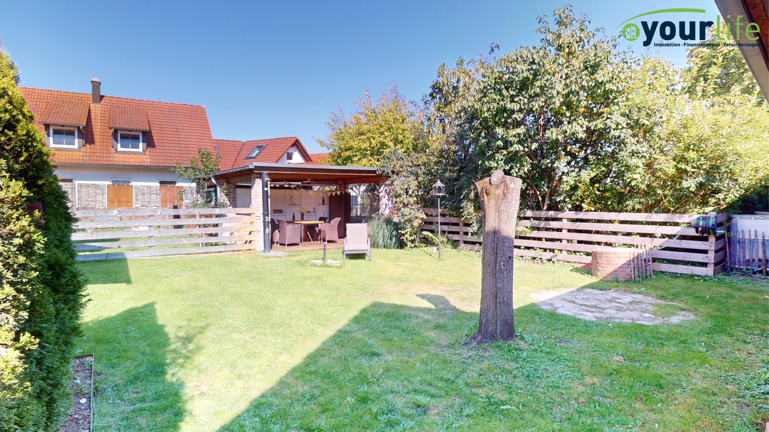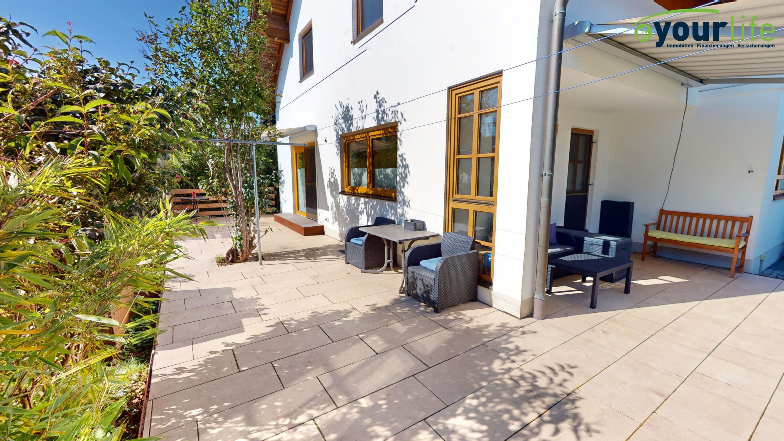 Die Außenanlage ist aufwendig gestaltet und gepflegt. Ein gemütlicher Freisitz wurde in Kombination mit dem Carport errichtet.