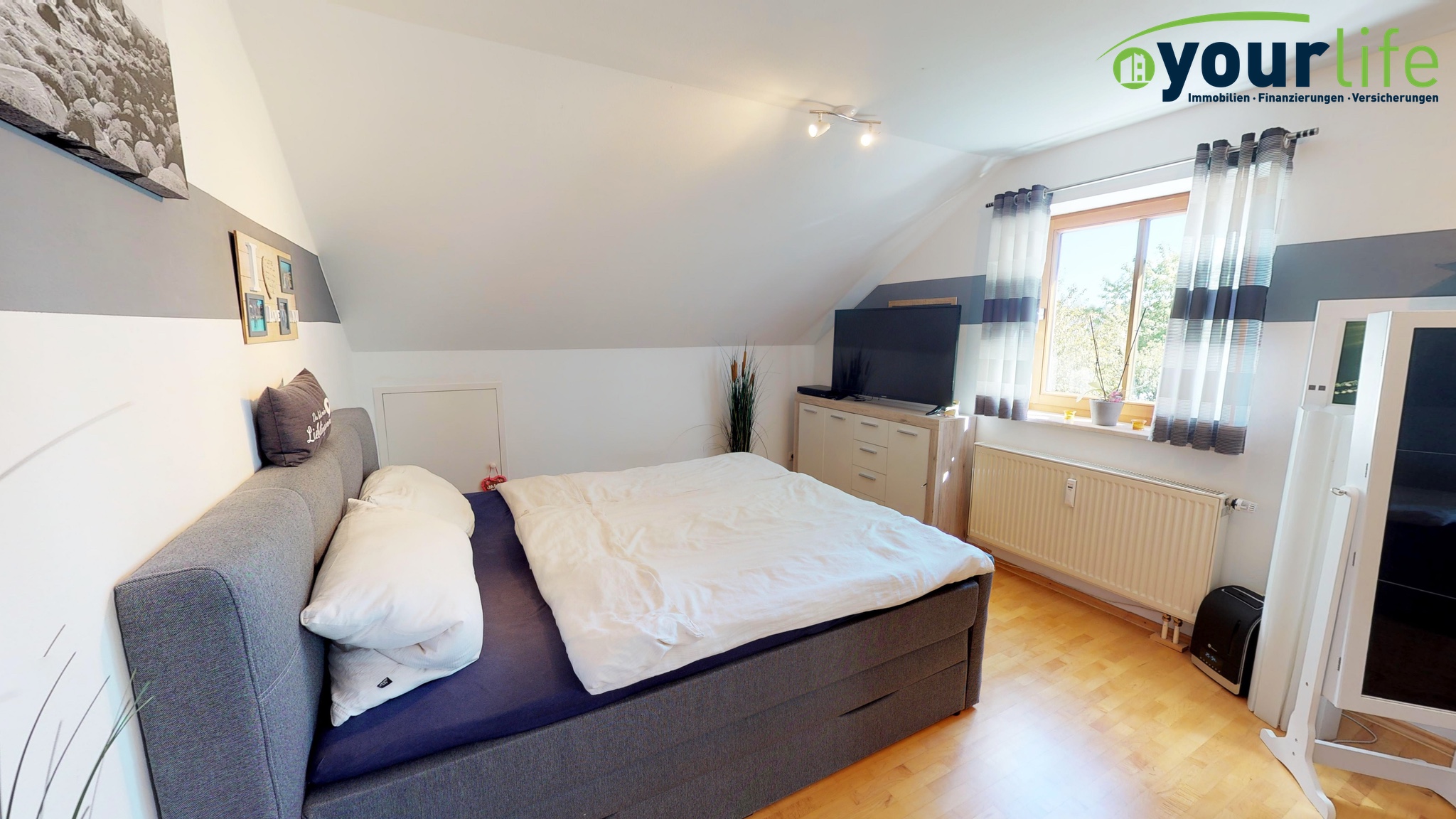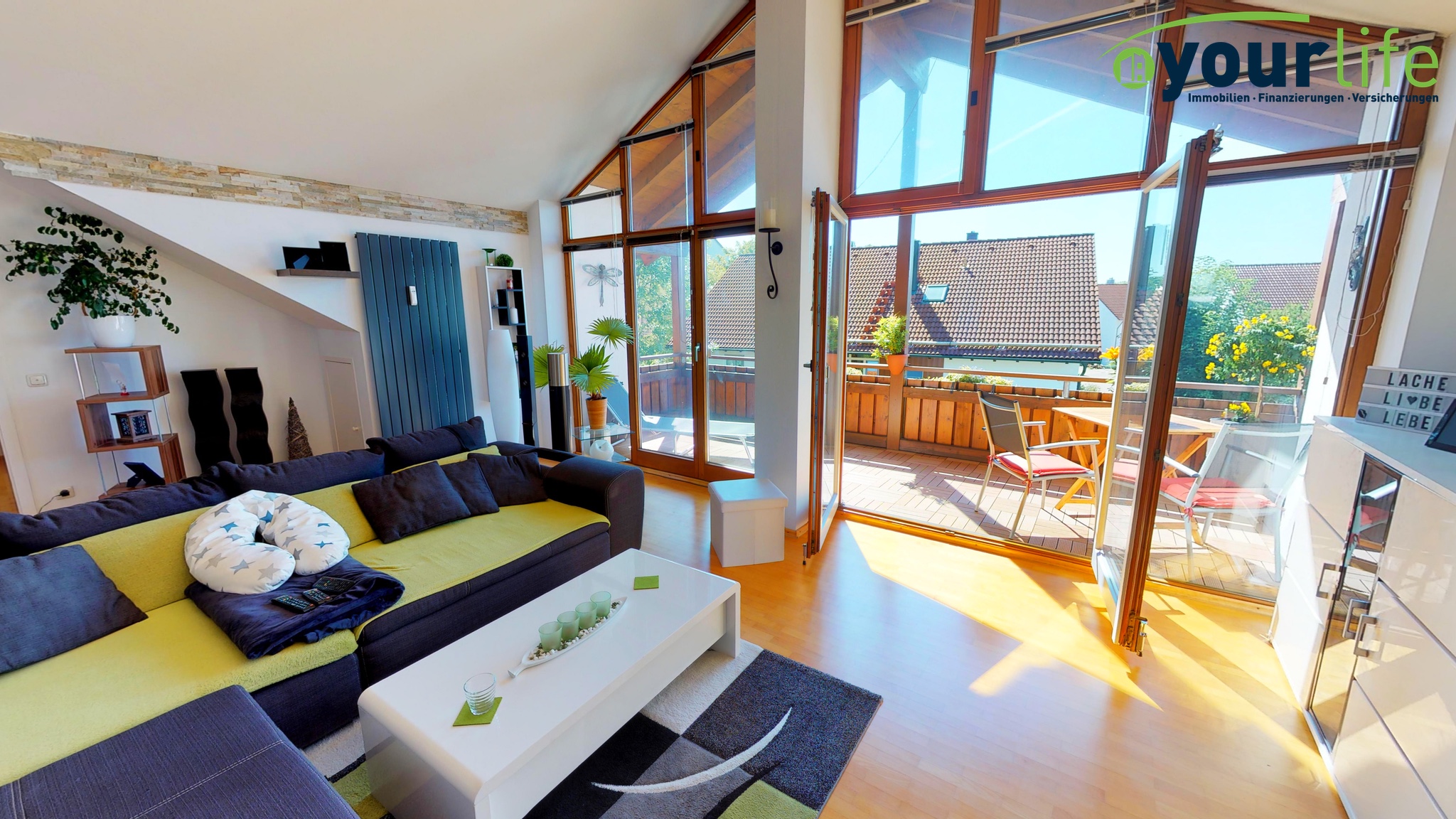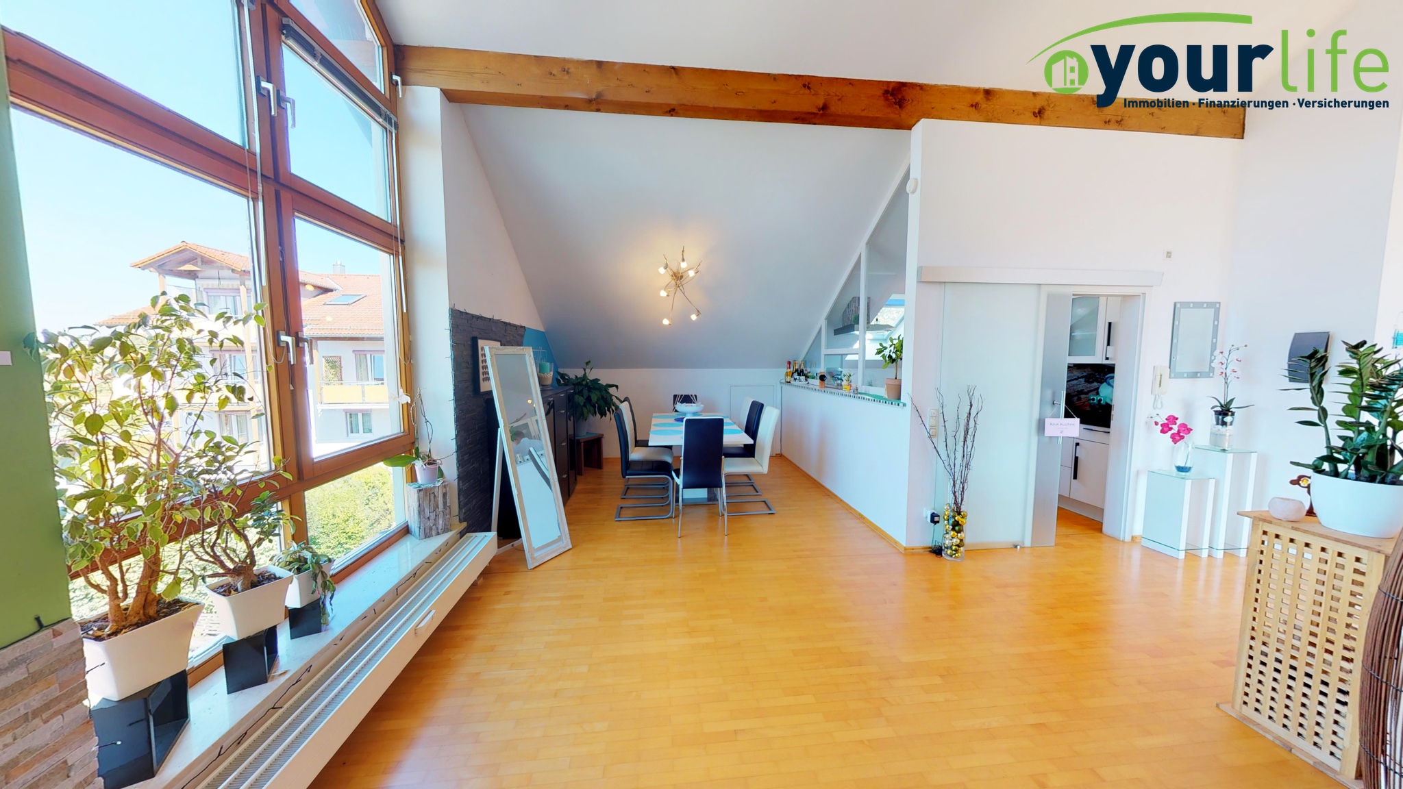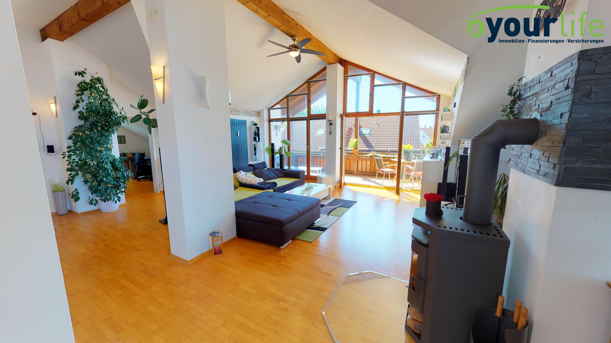 Diese schöne und große drei Zimmer Dachgeschosswohnung befindet sich in ein einem gepflegten Mehrfamilienhaus mit 5 Parteien. Das Gebäude wurde im Jahr 1991 in Massivbauweise erbaut. Die Wohnung bietet eine Wohnfläche von ca. 115 m². Der überdachte Süd-Balkon ist vom Wohnzimmer begehbar. Schöner Parkettboden, ein offener Dachstuhl mit Sichtbalken und ein Kaminofen im Wohnzimmer, schaffen eine tolle Atmosphäre.