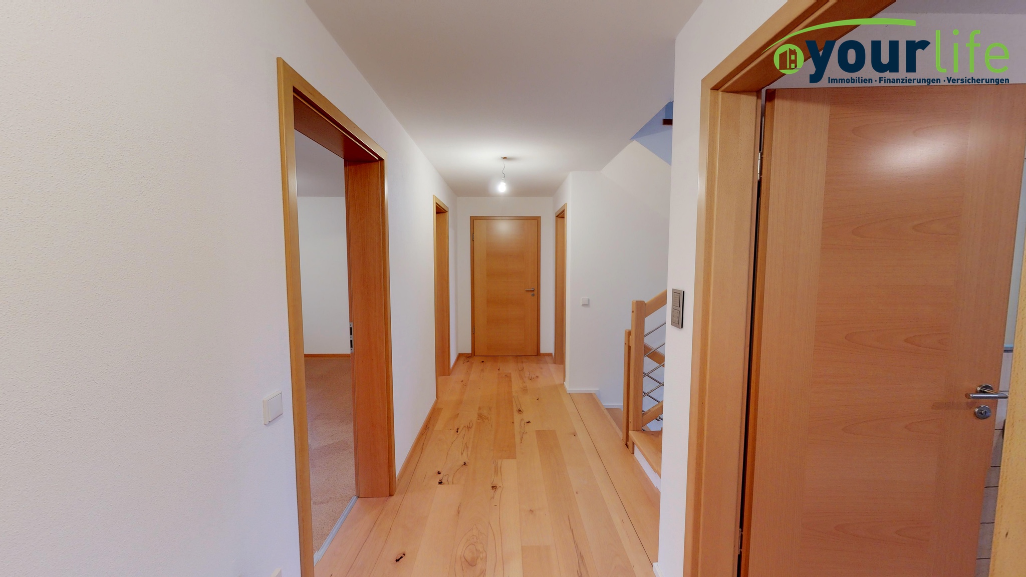 Im Obergeschoss befinden sich die Schlafräume und zwei Badezimmer. Im Flur liegt passenden zu der Buchenholztreppe ein schöner Parkett. Die Schlafzimmer sind mit Korkböden belegt.