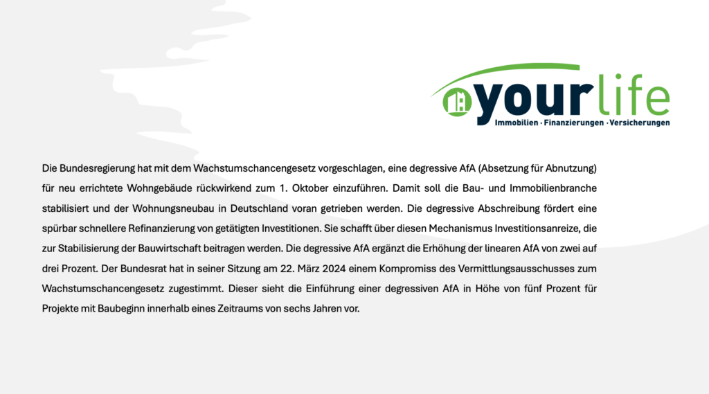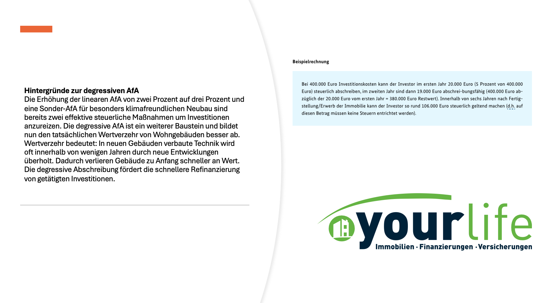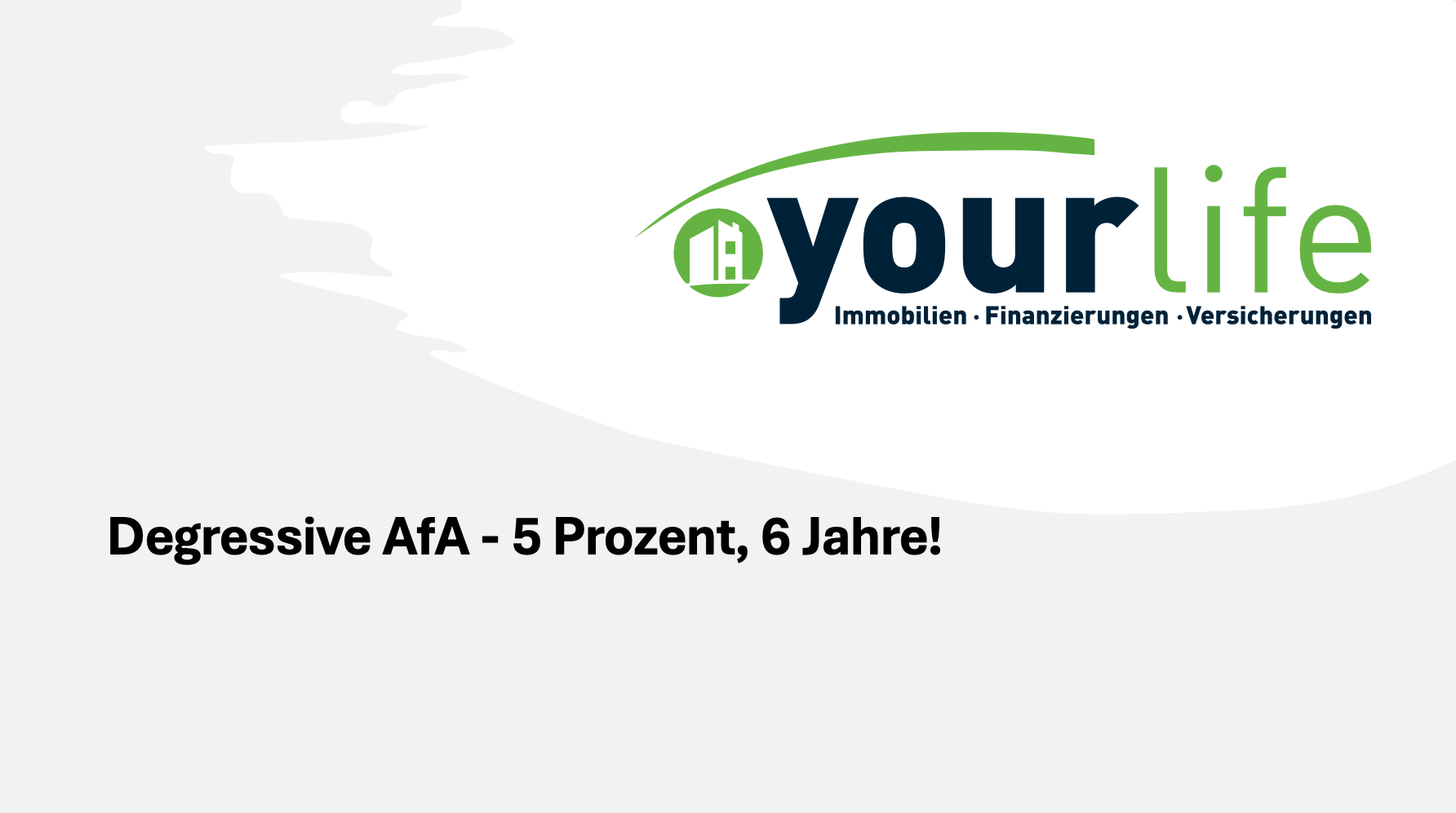 Degressive AfA – 5 Prozent, 6 Jahre! Mit diesem Blog werden wir das komplexe Thema „Immobilien & Grundstücke“ mit den wichtigsten Themen erklären. Blog – Beiträge mit Themen zur Immobilienbranche Degressive AfA – 5 Prozent, 6 Jahre! Sie möchten zu diesem Thema beraten werden? Nehmen Sie unverbindlich mit uns Kontakt auf!Kontaktaufnahme