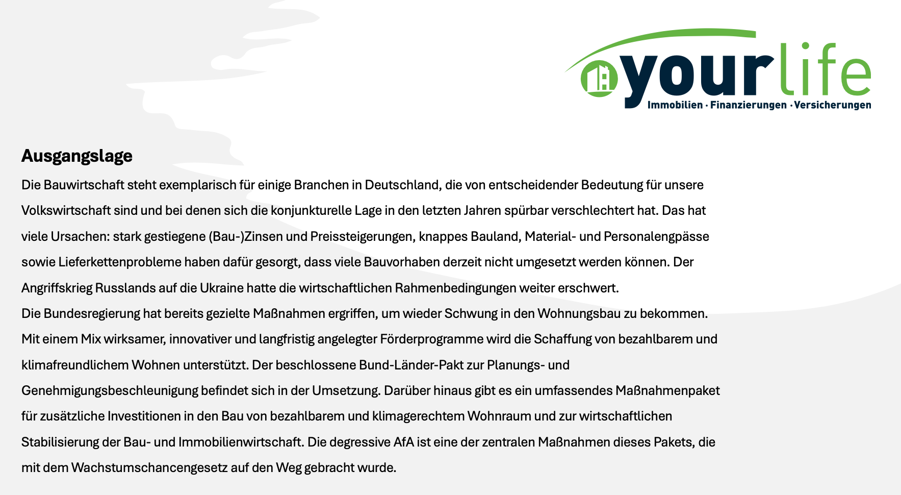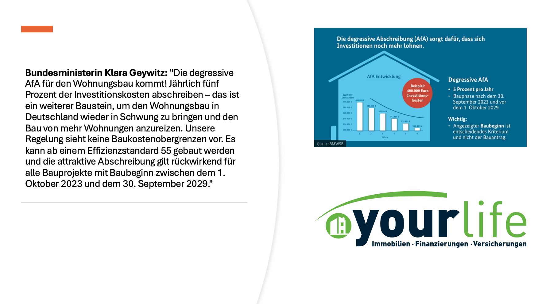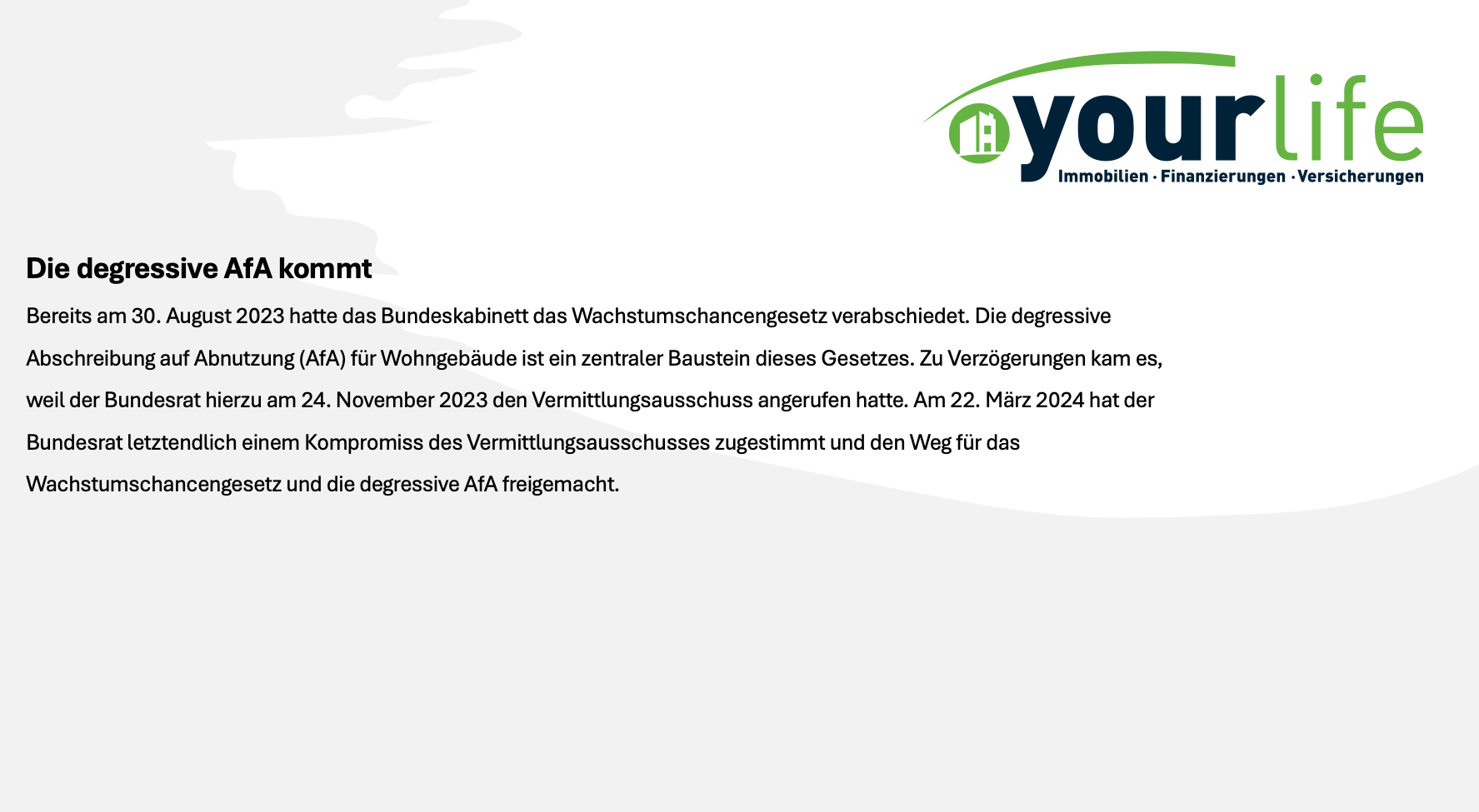 Degressive AfA – 5 Prozent, 6 Jahre! Mit diesem Blog werden wir das komplexe Thema „Immobilien & Grundstücke“ mit den wichtigsten Themen erklären. Blog – Beiträge mit Themen zur Immobilienbranche Degressive AfA – 5 Prozent, 6 Jahre! Sie möchten zu diesem Thema beraten werden? Nehmen Sie unverbindlich mit uns Kontakt auf!Kontaktaufnahme
